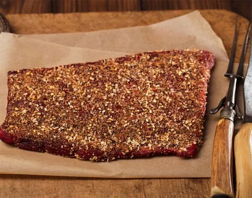 Tummassa oluessa Worcestershire- ja Tabasco-kastikkeessa marinoidut ulkofileepihvit hierotaan kahvilla ja mausteilla ennen kuin ne grillataan täydelliseksi.