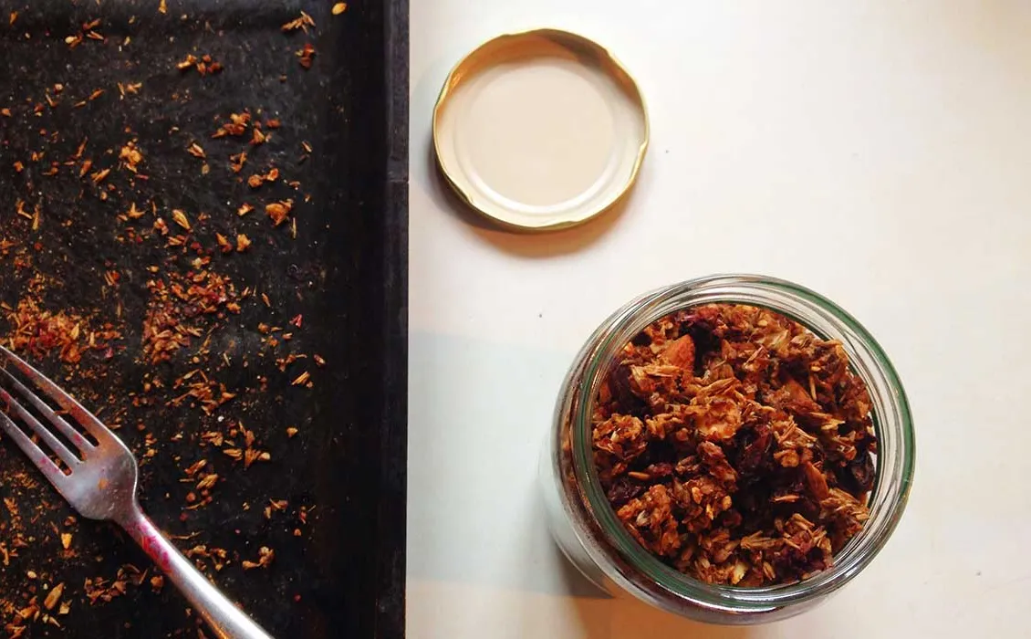 Ensimmäisen kerran tein käytetyn viljan granolaa Corkin kreivikunnassa Irlannissa kolmen kuukauden ajan ruoanlaittoohjelmassa 100 hehtaarin kokoisella maatilalla. Ystäväni oli panimo Uudesta-Seelannista, ja vietimme suurimman osan amerikkalaisen kiitospäivän kotipanimosta kuivahumalattua paletta, jossa oli seljankukkia irlantilaisessa mökissä, jota ympäröivät lehmät. Tämä oli kolmas kotipanimon kerta: olut ei ollut huono, mutta ei hyväkään. Erottuva oli paahteinen pureskeltava granola, jonka teimme käytetystä viljasta, joka oli paistettu lämmittävillä mausteilla kuivatuilla hedelmillä ja tummalla vaahterasiirappilla. Söimme granolan Jerseyn lehmien jogurtin kanssa lähellä olevaa jogurttia niin rasvaista ja kirpeää, kanteen tarttuvaa kermaa vaaleankeltaisessa korkissa. Granola oli jatkoa ensimmäiselle perusperiaatteelle, jonka opin ruoanlaitossa ja maanviljelyssä: älä tuhlaa.