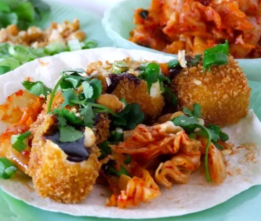 Aasialaisen oluen paahdettuja tofutacoja kotitekoisella Kimchillä